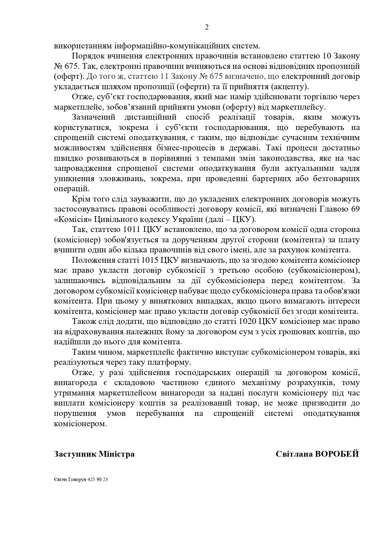 Кроме того, Министерство привело нормы Гражданского кодекса Украины о договоре комиссии и отметило, что маркетплейс в такой модели фактически может выступать субкомиссионером. Следовательно, содержание вознаграждения платформой является частью единого механизма расчетов, а не отдельной неденежной операцией.