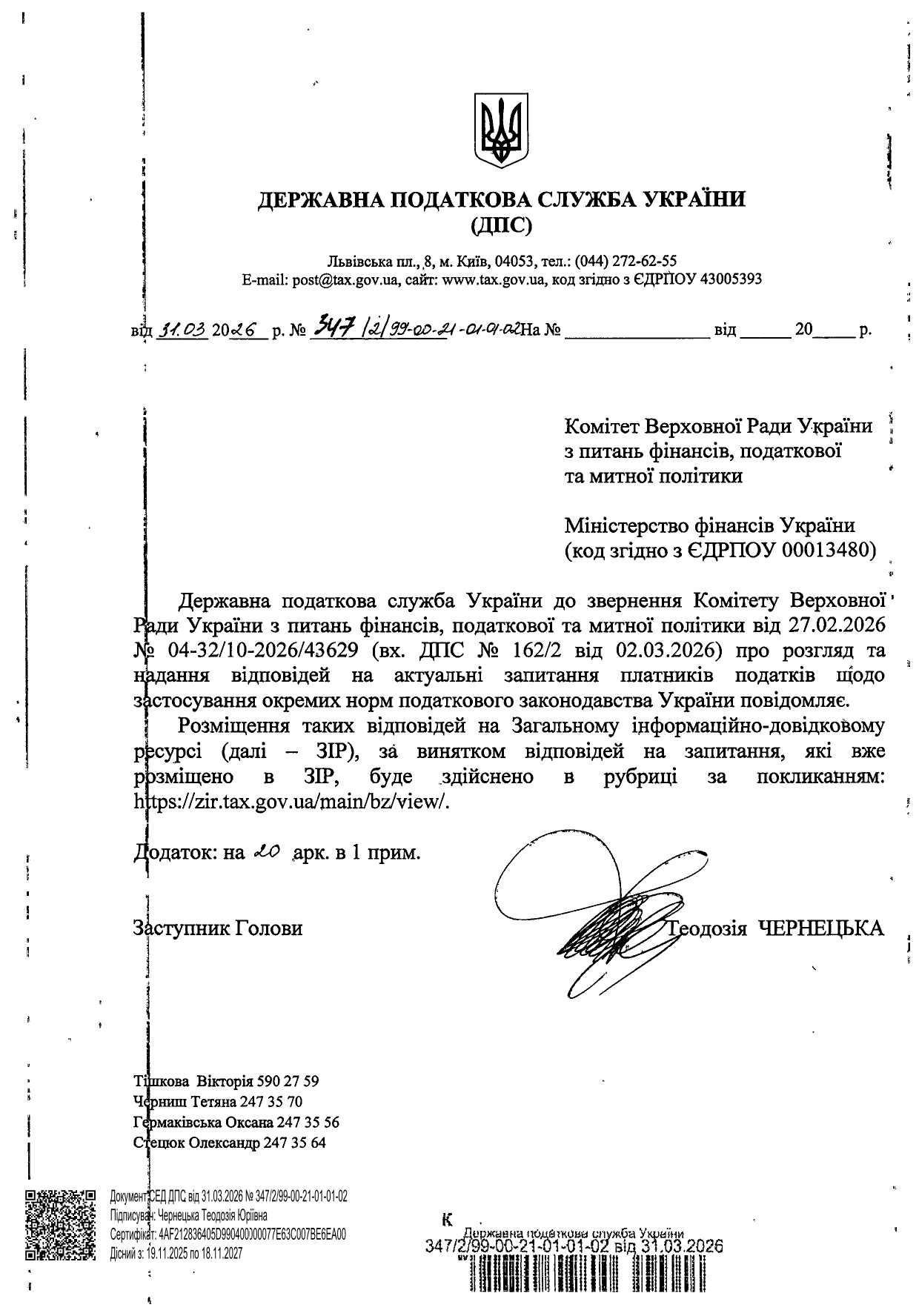 На запрос Комитета ВР по вопросам финансов, налоговой и таможенной политики ГНС в письме от 31.03.2026 № 347/2/99-00-21-01-01-02 предоставила ответы относительно применения отдельных норм налогового законодательства Украины.