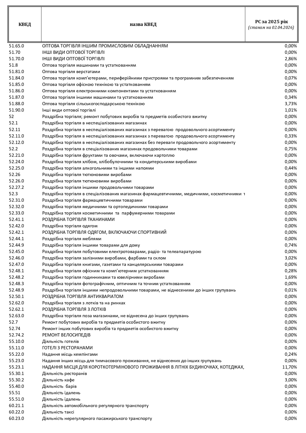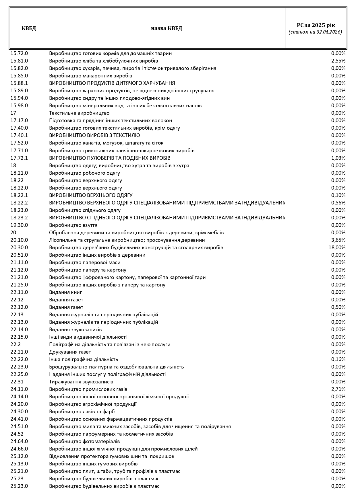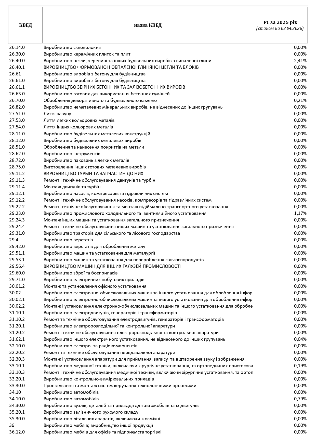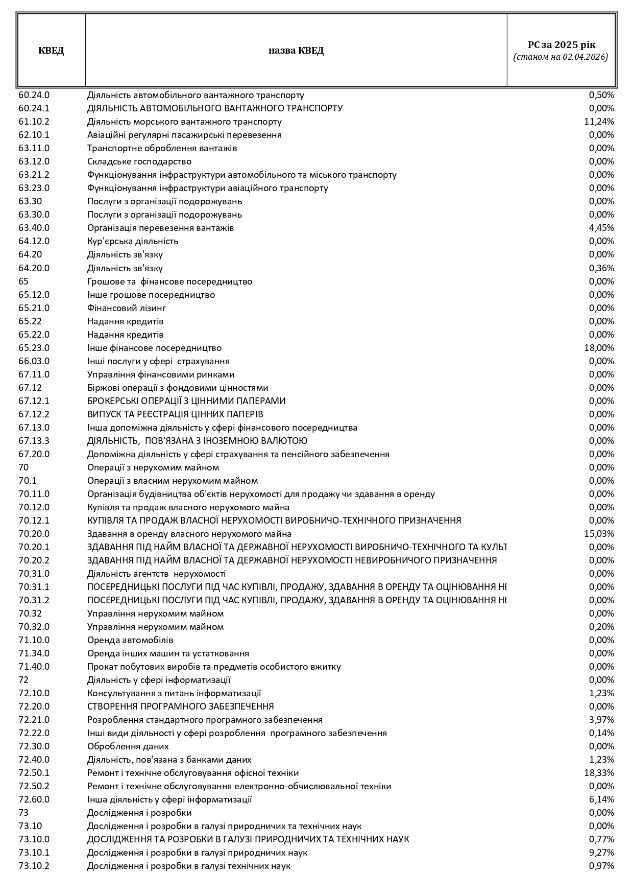ГНС обнародовала показатели налоговой эффективности (уровень уплаты) по налогу на прибыль предприятий по данным налоговой отчетности за 2025 год, по состоянию на 02.04.2026, сформированной по видам экономической деятельности на уровне класса согласно классификации видов экономической деятельности ДК 009:2010.