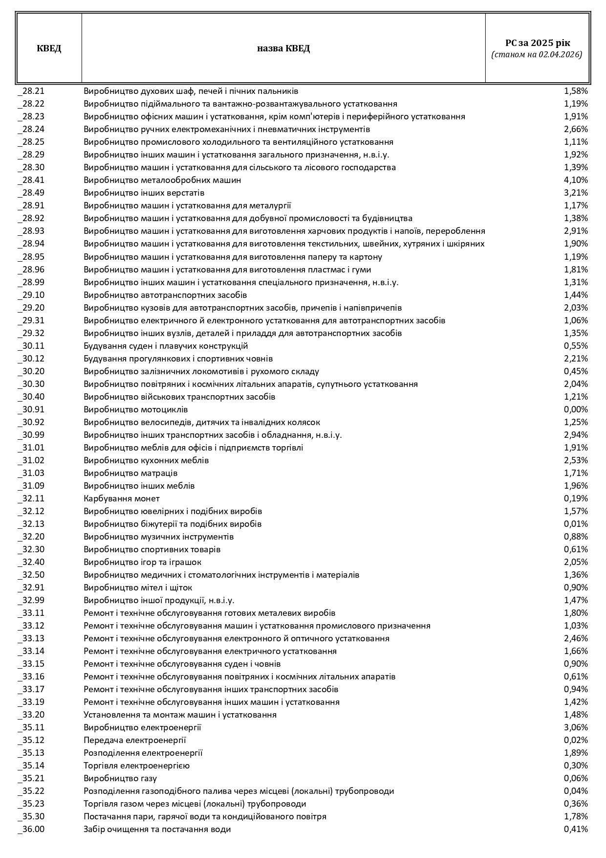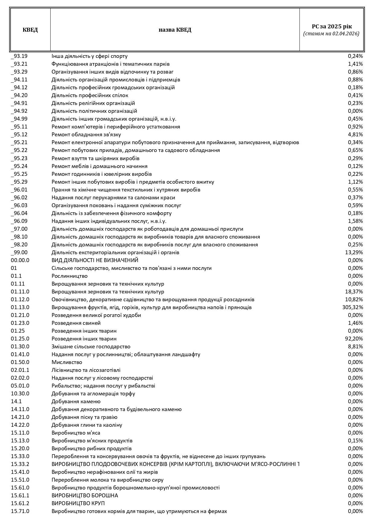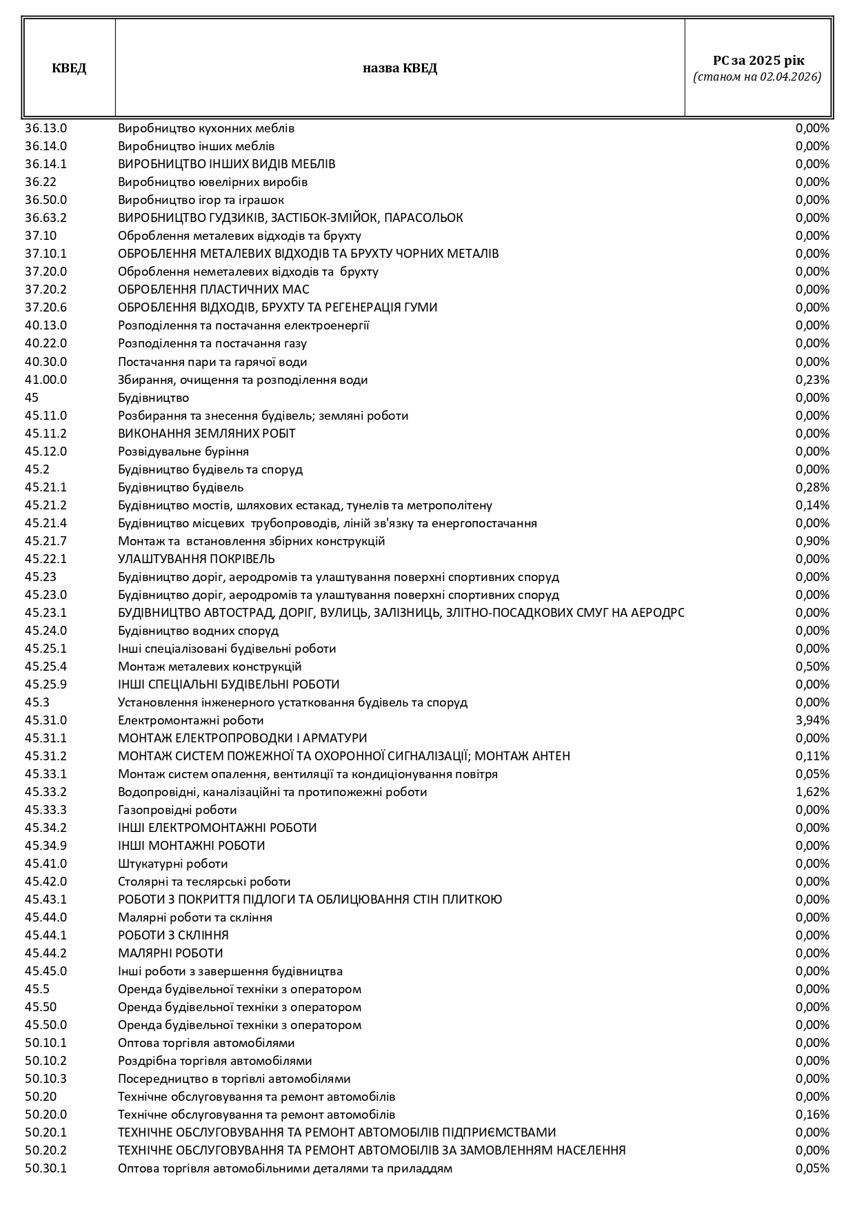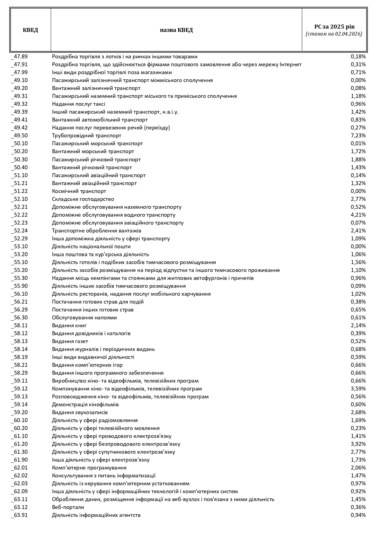 ГНС обнародовала показатели налоговой эффективности (уровень уплаты) по налогу на прибыль предприятий по данным налоговой отчетности за 2025 год, по состоянию на 02.04.2026, сформированной по видам экономической деятельности на уровне класса согласно классификации видов экономической деятельности ДК 009:2010.