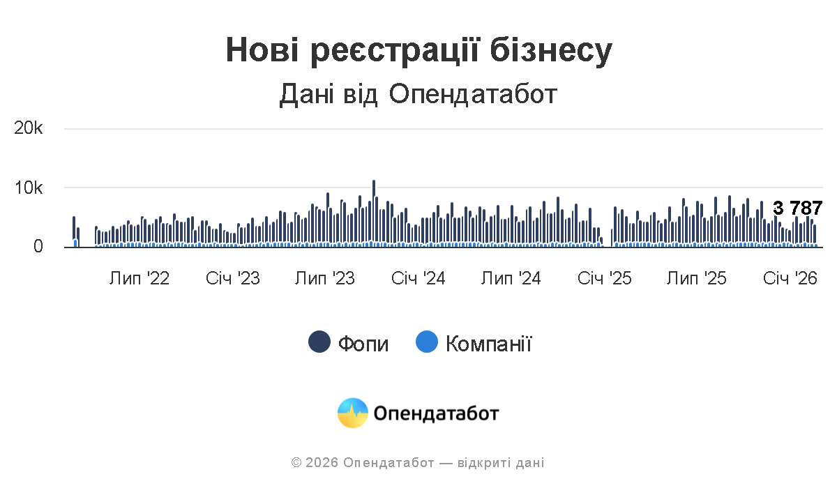 5 676 ФЛП та 1 077 компаний в неделю, в среднем, открывалось накануне полномасштабного вторжения в 2021 году. В начале февраля 2022 года предприниматели зарегистрировали за неделю рекордные 9 350 ФЛП. С началом полномасштабного вторжения реестры закрылись, а регистрация новых бизнесов стала невозможной. После возобновления работы ЕГР в конце марта было 3 565 регистраций ФЛП и 289 новых компаний. В целом в 2022 году открытий новых дел стало меньше: на 28 % меньше новых предпринимателей в неделю и на 40 % – компаний.