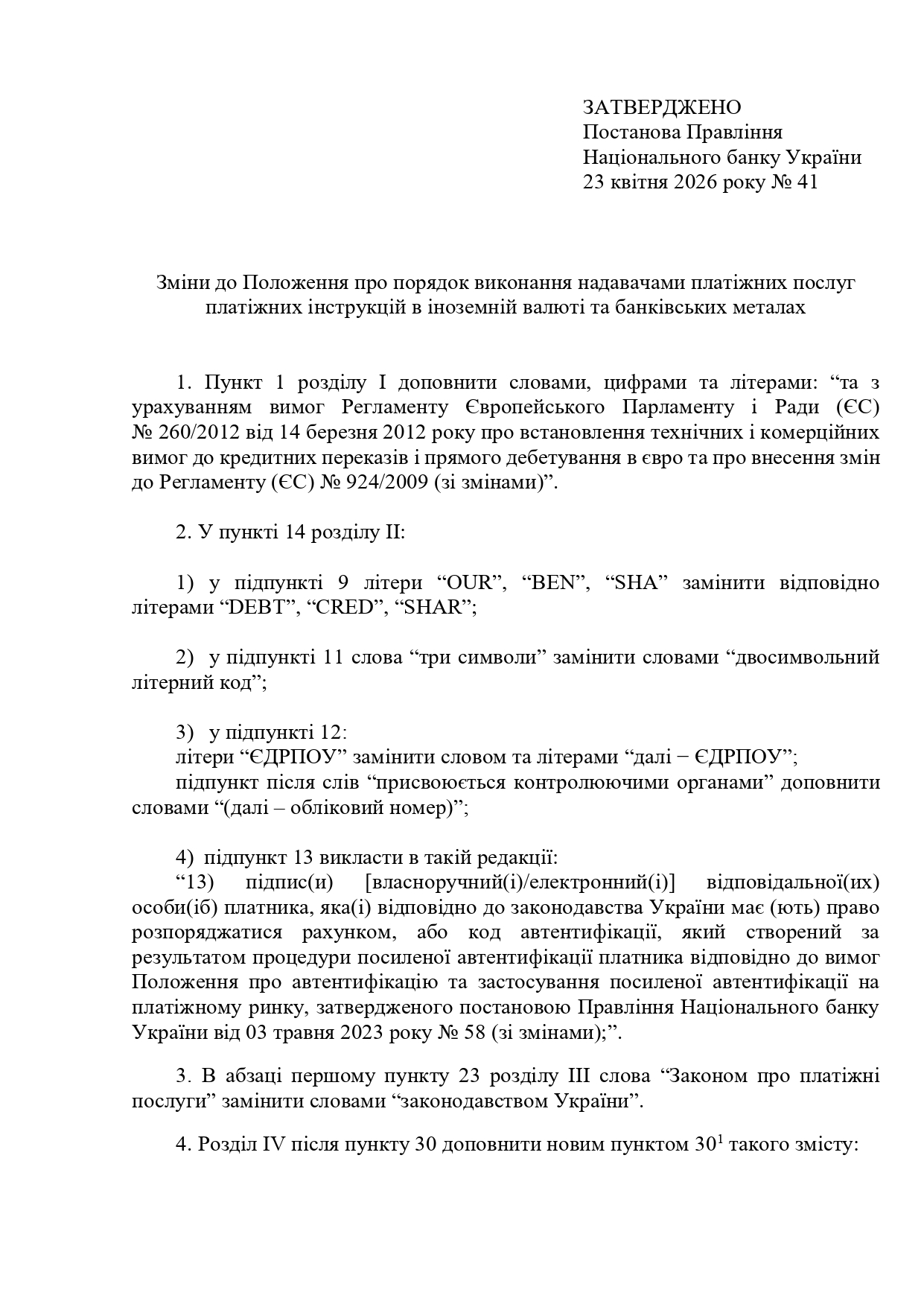 Соответствующие нормы содержит постановление Правления НБУ от 04.2026 № 41 «Об утверждении Изменений к Положению о порядке выполнения предоставителями платежных услуг платежных инструкций в иностранной валюте и банковских металлах», которое вступает в силу с 28 апреля 2026 года.