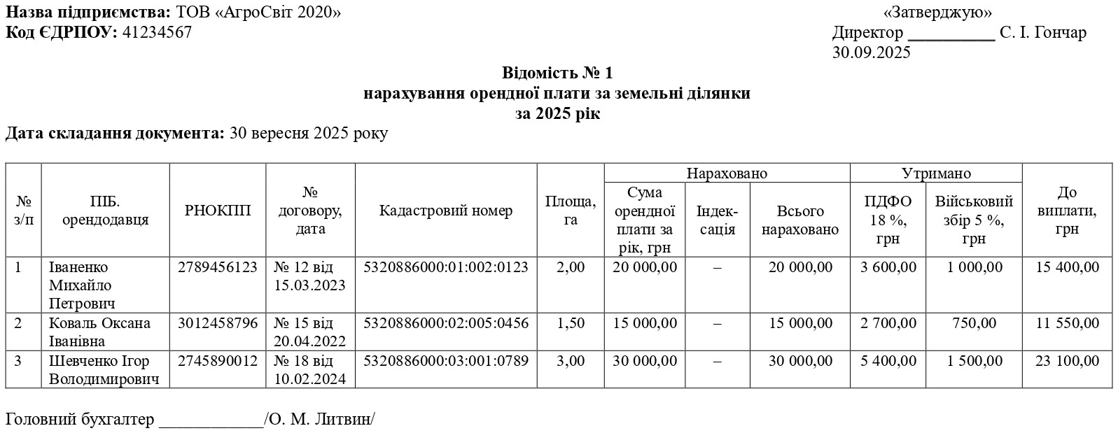 Будь-яка господарська операція, зокрема й нарахування орендної плати фізичним особам за оренду земельних ділянок, має бути підтверджена належним чином оформленими первинними документами. Це прямо передбачено ст. 9 Закону від 16.07.1999 № 996-XIV «Про бухгалтерський облік та фінансову звітність в Україні» (далі – Закон № 996), яка встановлює обов’язкові реквізити для первинних документів (дата, зміст операції, сума, підписи відповідальних осіб тощо).