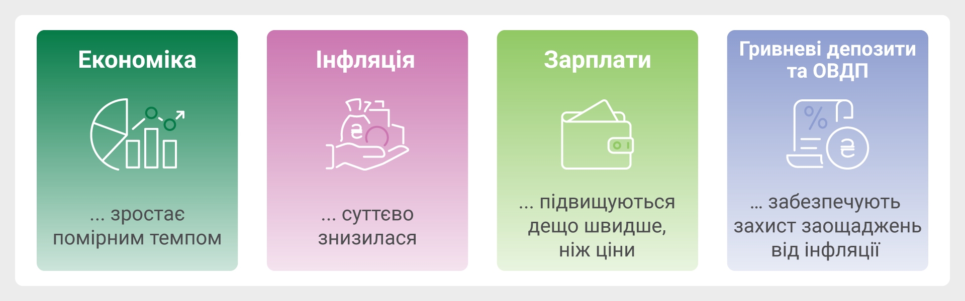 Водночас російські обстріли не зупинили економіку, вона надалі зростає. Торік аграрії зібрали високі врожаї та успішно експортують частину продукції за кордон. Оборонні замовлення та проєкти з відновлення інфраструктури підтримують металургію, машинобудування та будівництво. Високі бюджетні видатки на соціальну сферу підживлюють споживчі витрати населення. Тож НБУ лише помірно погіршив прогноз зростання реального ВВП України на 2026 рік – із 2 % до 1,8 %.