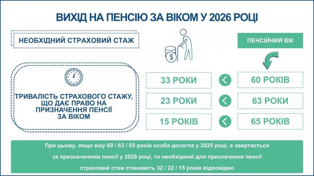 При цьому, якщо віку 60/63/65 років особа досягла у 2025 році, а звертається за призначенням пенсії у 2026 році, то необхідний для призначення пенсії страховий стаж становить 32/22/15 років відповідно.