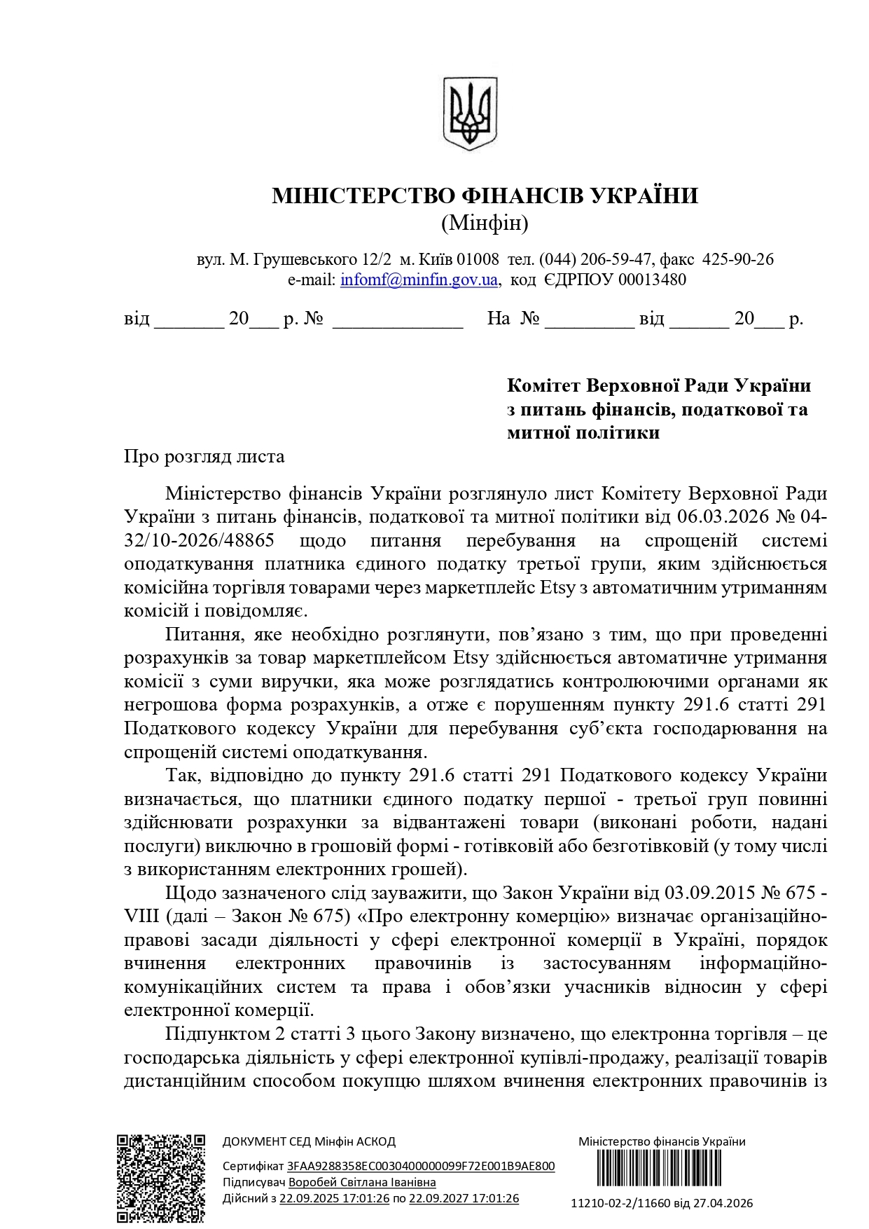 Мінфін у листі від 27.04.2026 № 11210-02-2/11660 висловив нову офіційну позицію щодо роботи платників єдиного податку через міжнародний маркетплейс Etsy. Документ стосується ситуації, коли продавець реалізує товари нерезидентам через платформу, а маркетплейс автоматично утримує свою комісію із суми виручки.