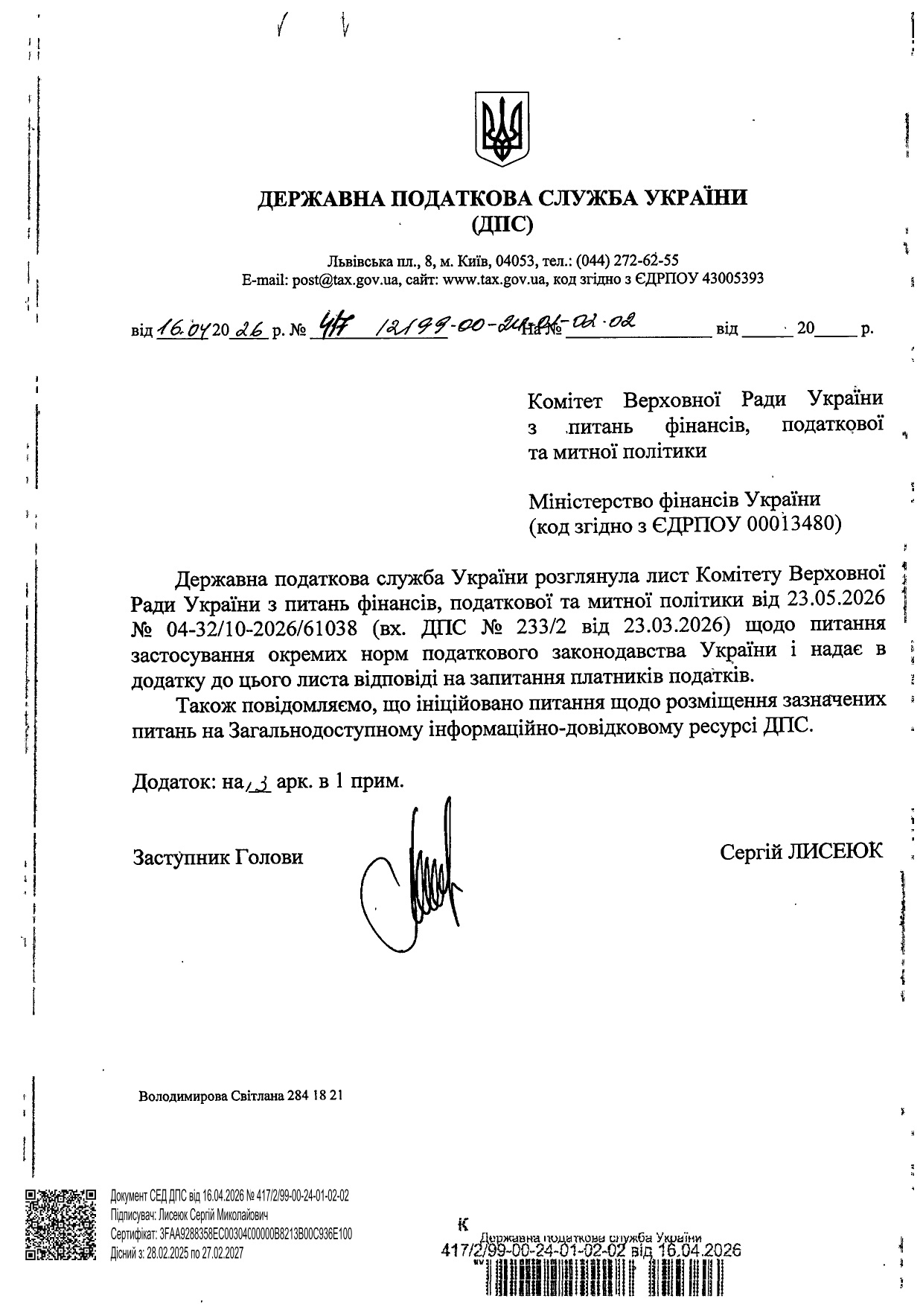 На запит Комітету ВРУ з питань фінансів, податкової та митної політики ДПС у листі від 16.04.2026 № 417/2/99-00-24-01-02-02 надала відповіді щодо застосування окремих норм податкового законодавства України.