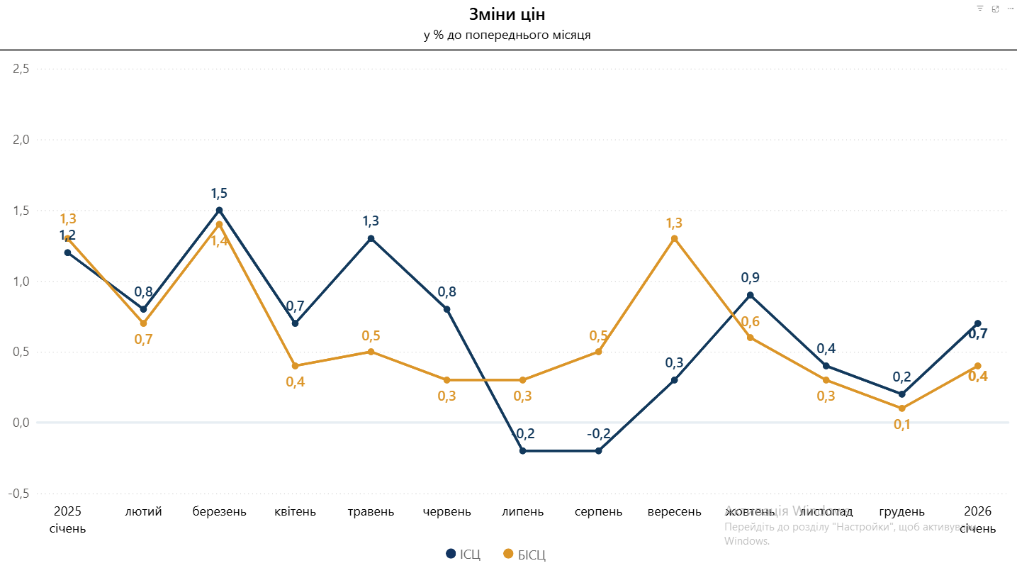 Базова інфляція в січні 2026 року порівняно із груднем 2025 року становила 0,4 %, із січнем 2025 року – 7,0 %.