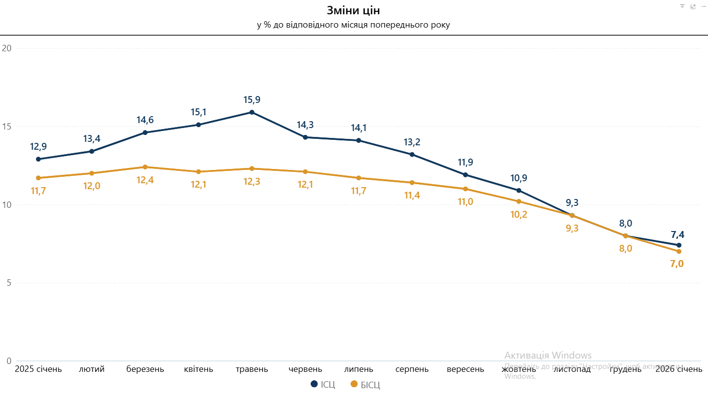 Інфляція на споживчому ринку в січні 2026 року порівняно із груднем 2025 року становила 0,7 %, із січнем 2025 року – 7,4 %.