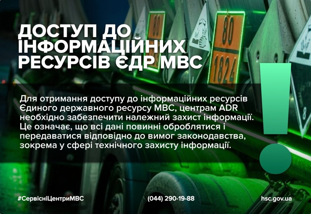 Для отримання доступу до інформаційних ресурсів Єдиного державного ресурсу МВС, центрам ADR необхідно забезпечити належний захист інформації. Це означає, що всі дані повинні оброблятися і передаватися відповідно до вимог законодавства, зокрема у сфері технічного захисту інформації. Відповідальність за виконання цих вимог несуть усі центри спеціального навчання, що здійснюють підготовку, перепідготовку водіїв транспортних засобів, що перевозять небезпечні вантажі, та уповноважених з питань безпеки перевезень небезпечних вантажів автомобільними дорогами.