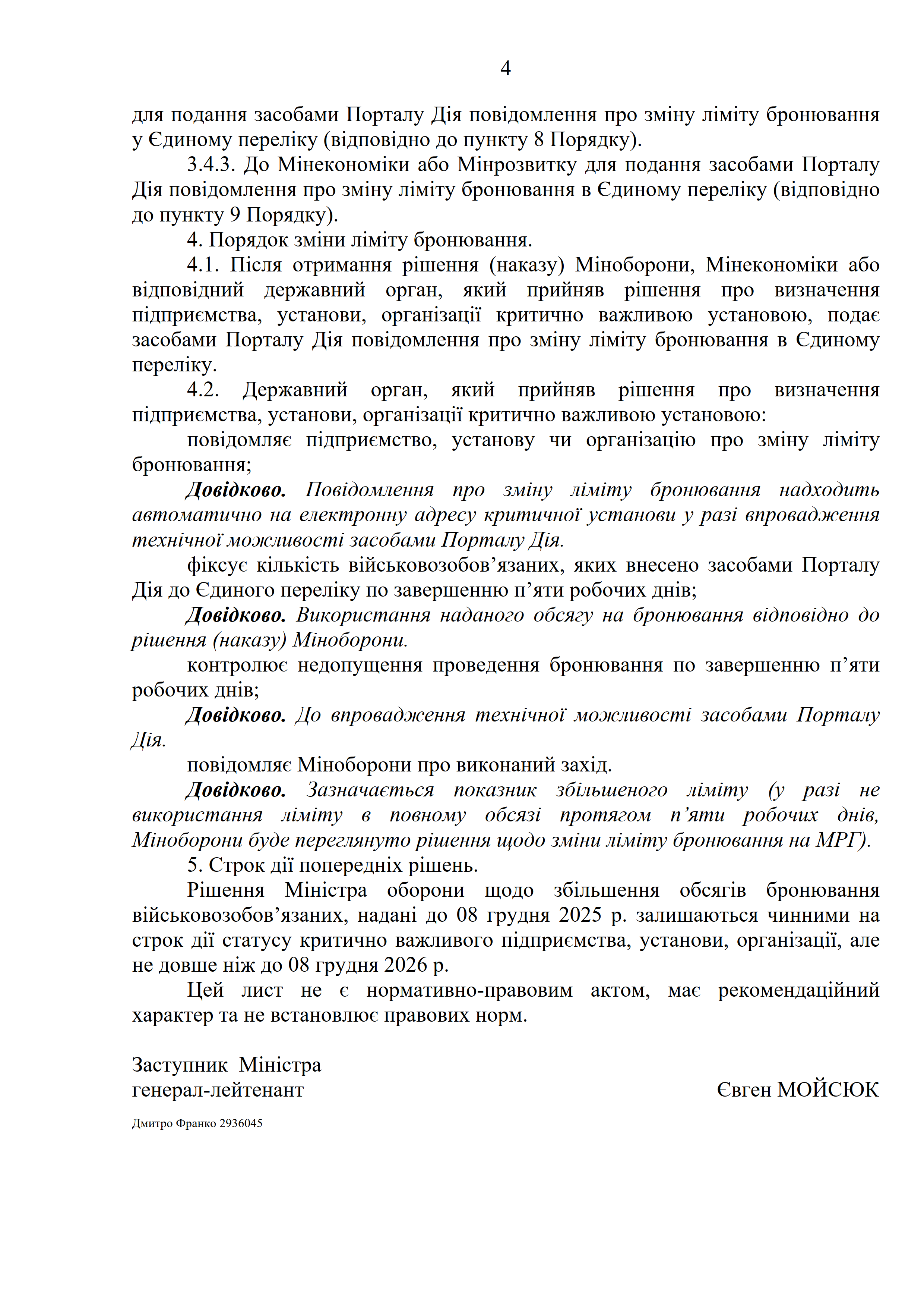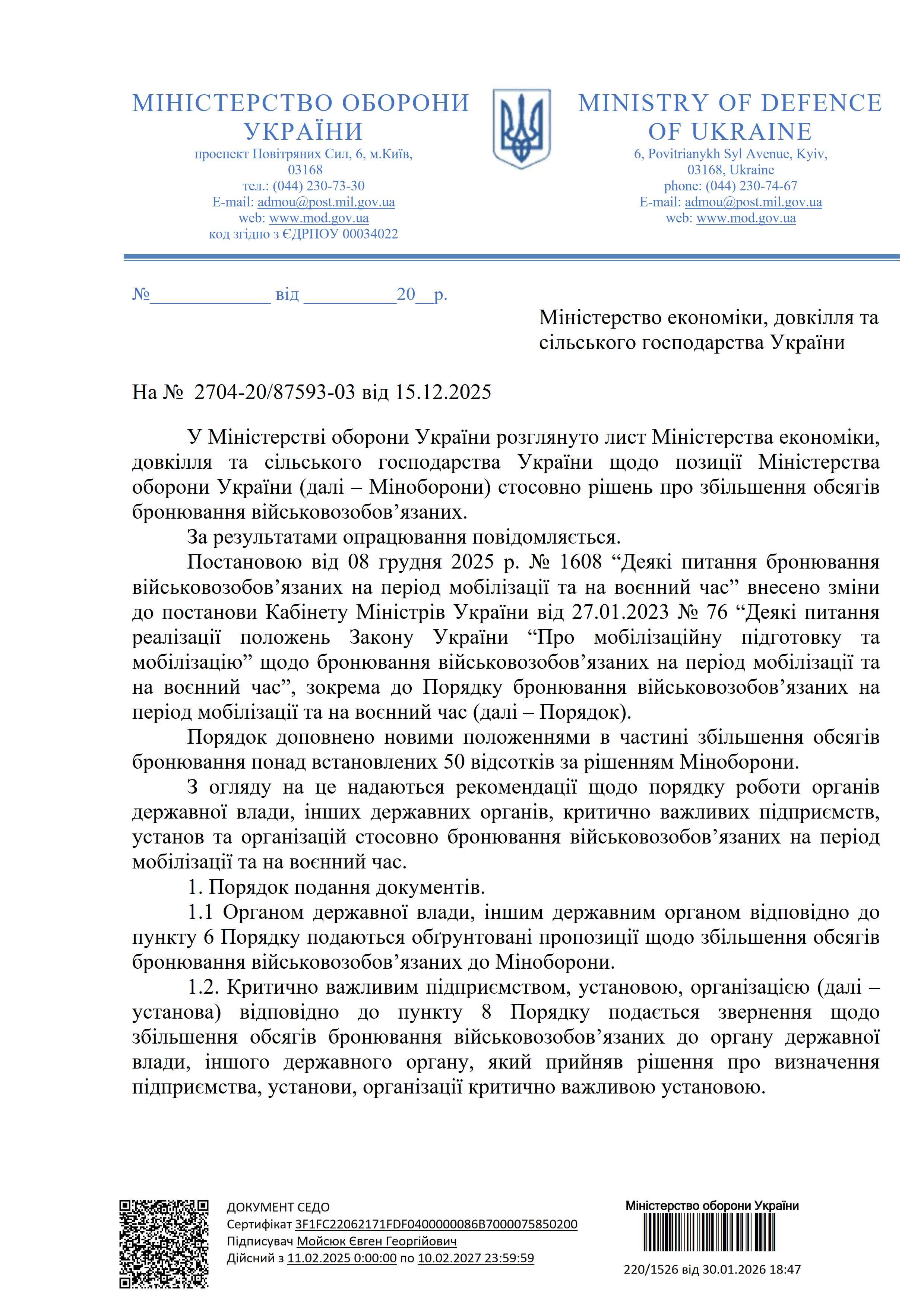 Міноборони листом від 30.01.2026 № 220/1526 висловило свою позицію стосовно рішень про збільшення обсягів бронювання військовозобов’язаних.