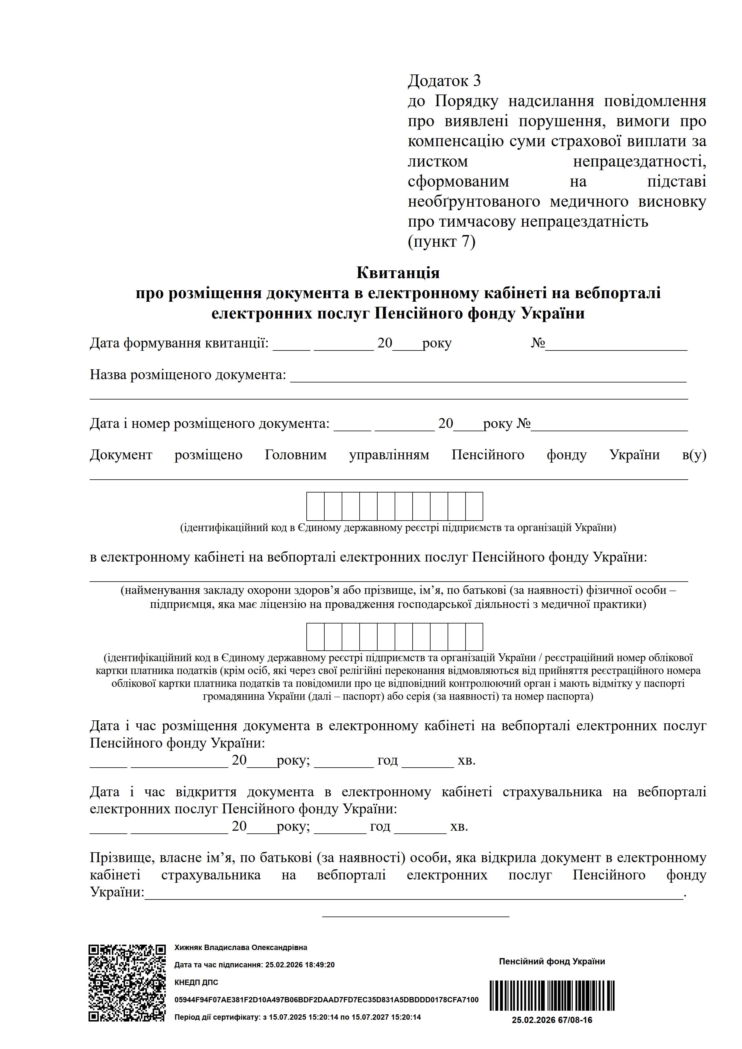 Встановлено чіткі строки для направлення таких повідомлень. Форми повідомлення про порушення та вимоги про компенсацію закріплені у додатках до постанови. Окремо визначено форму квитанції про розміщення документа в електронному кабінеті на вебпорталі електронних послуг ПФУ.