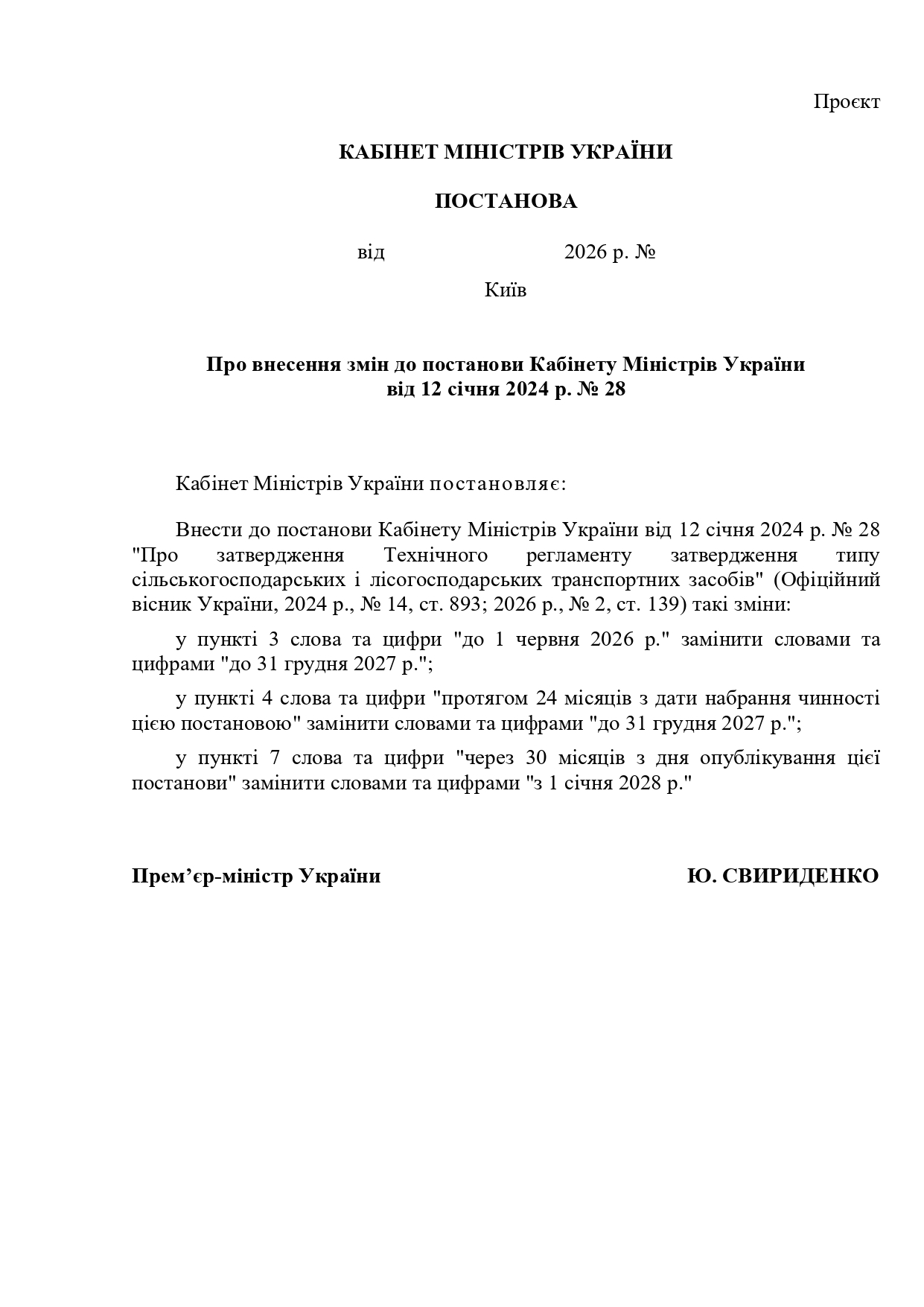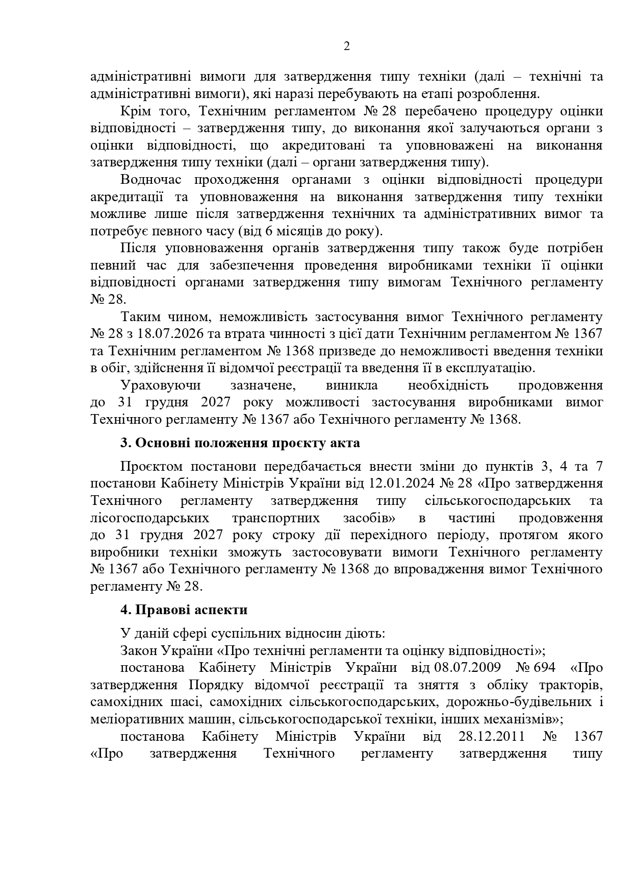 Постановою КМУ від 12.01.2024 № 28 «Про затвердження Технічного регламенту затвердження типу сільськогосподарських та лісогосподарських транспортних засобів» (набрала чинності з 18.07.2024) визначено перехідний період до 18.07.2026, протягом якого виробник техніки може застосовувати на свій вибір Техрегламент № 28 або Технічний регламент затвердження типу сільськогосподарських та лісогосподарських тракторів, їх причепів і змінних причіпних машин, систем, складових частин та окремих технічних вузлів, затверджений постановою КМУ від 28.12.2011 № 1367 (далі – Техрегламент № 1367), чи Технічний регламент щодо складових частин і характеристик колісних сільськогосподарських та лісогосподарських тракторів, затверджений постановою КМУ від 28.12.2011 № 1368 (далі – Техрегламент № 1368).