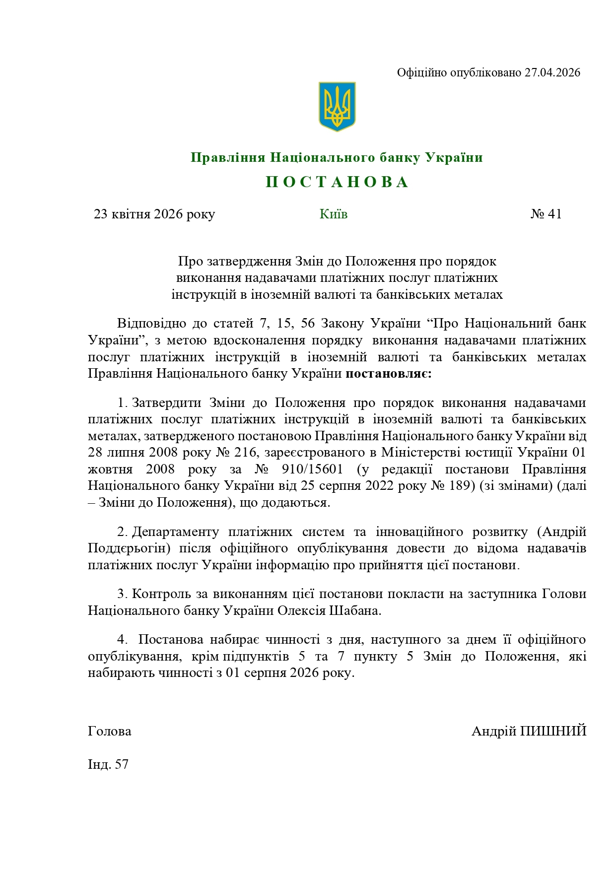 Відповідні норми містить постанова Правління НБУ від 23.04.2026 № 41 «Про затвердження Змін до Положення про порядок виконання надавачами платіжних послуг платіжних інструкцій в іноземній валюті та банківських металах», що набирає чинності з 28 квітня 2026 року.